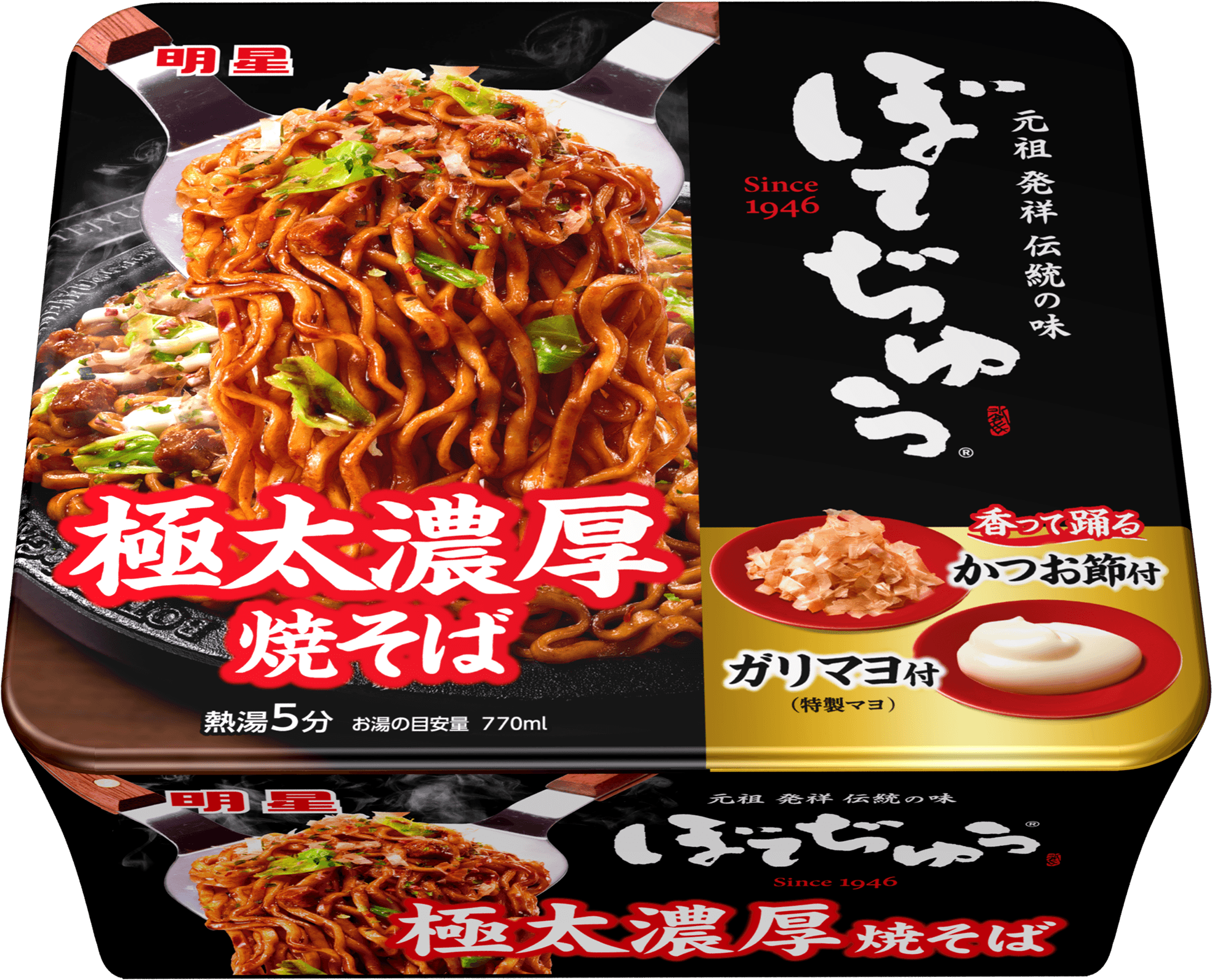 この度、大人気コラボが再び実現し、ぼてぢゅう(R)の香ばしい焼そばを再現した、カップ焼そば「明星 ぼてぢゅう 極太濃厚焼そば」が発売となります。