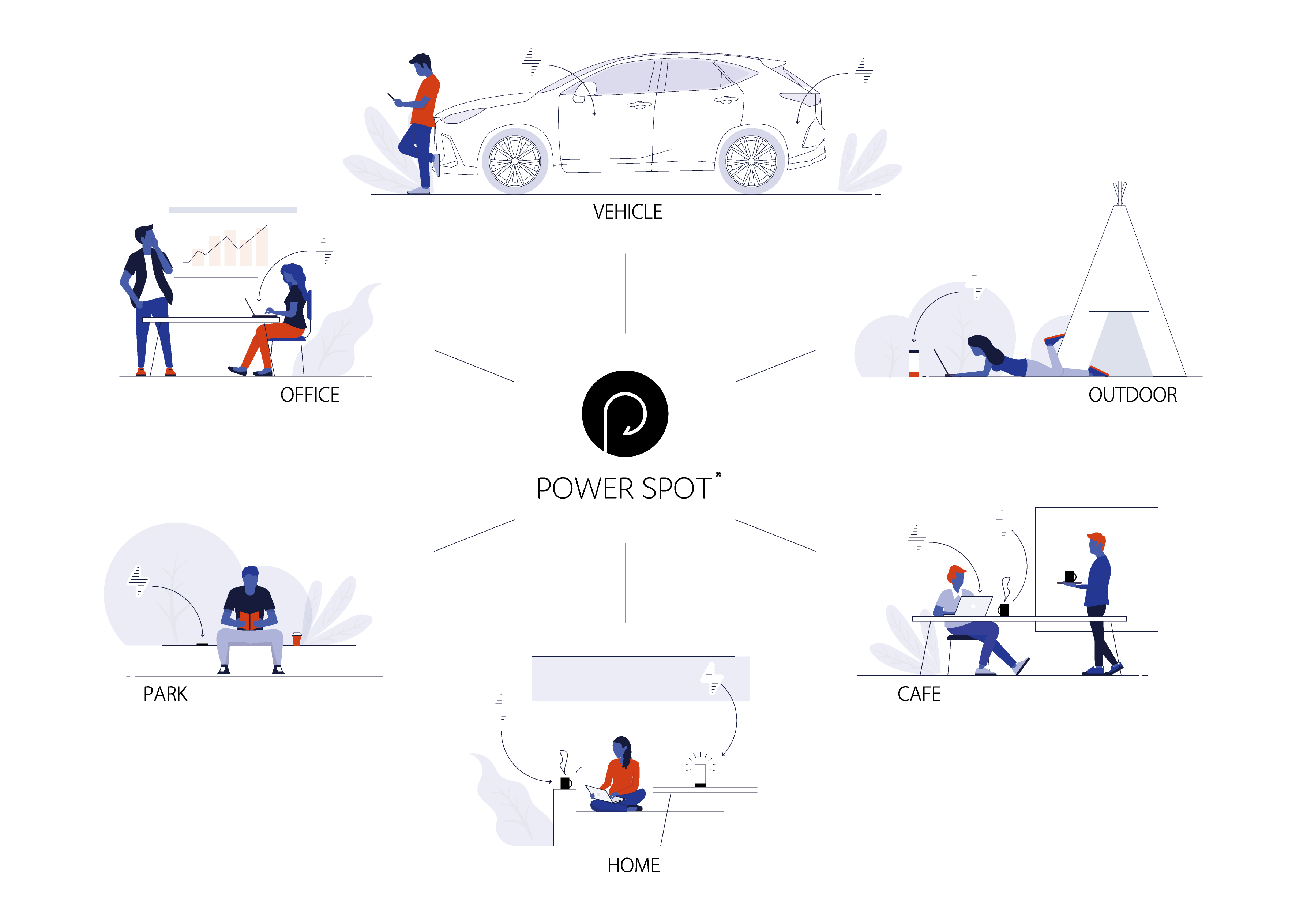 POWER SPOT(R)はベルデザインが株式会社ベルニクスの電磁誘導方式技術を用い生み出した、50Wワイヤレス給電プラットフォームです。POWER SPOT(R)はケーブルから機器を開放し、ケーブルから解放された機器は左右に回転させることで、電源のON/OFFなどの直感的な操作を実現します。
