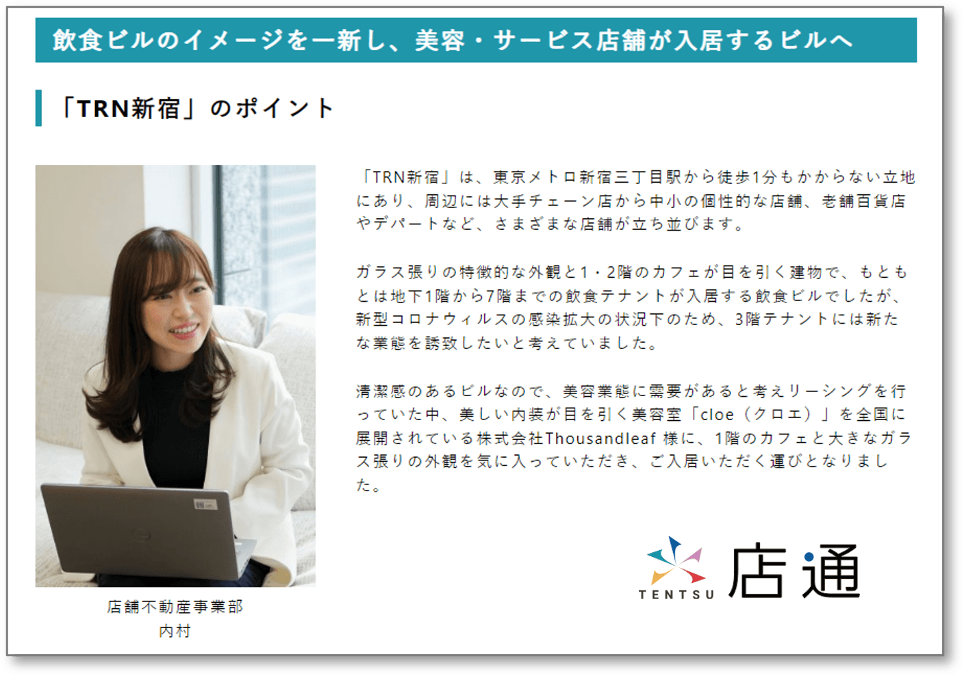 当社のオウンドメディア「店通-TENSTU-」で発信する情報と連携することで、より確実で幅広い情報を入手することができます。不動産の収益、賃料収入を得るためのテナントリーシングが最大の強みである当社だからこそできる不動産の開発、有効活用、コンバージョン、マスターリース、建物管理、物件取得などあらゆるリソースを活用した実績もご覧いただけます。