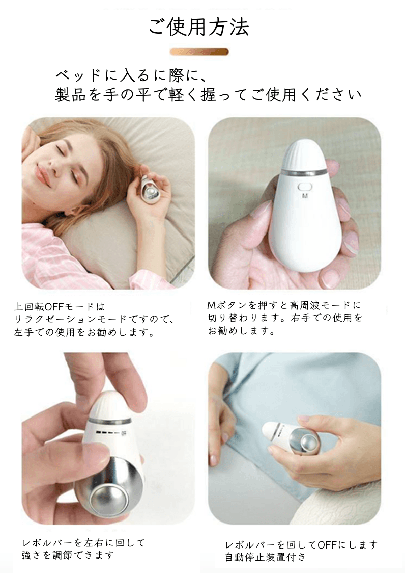 1.おやすみの際やリラックスしたい時、軽く握り締めるだけ (スイッチを入れると銀色部分から微弱電流が流れます。)