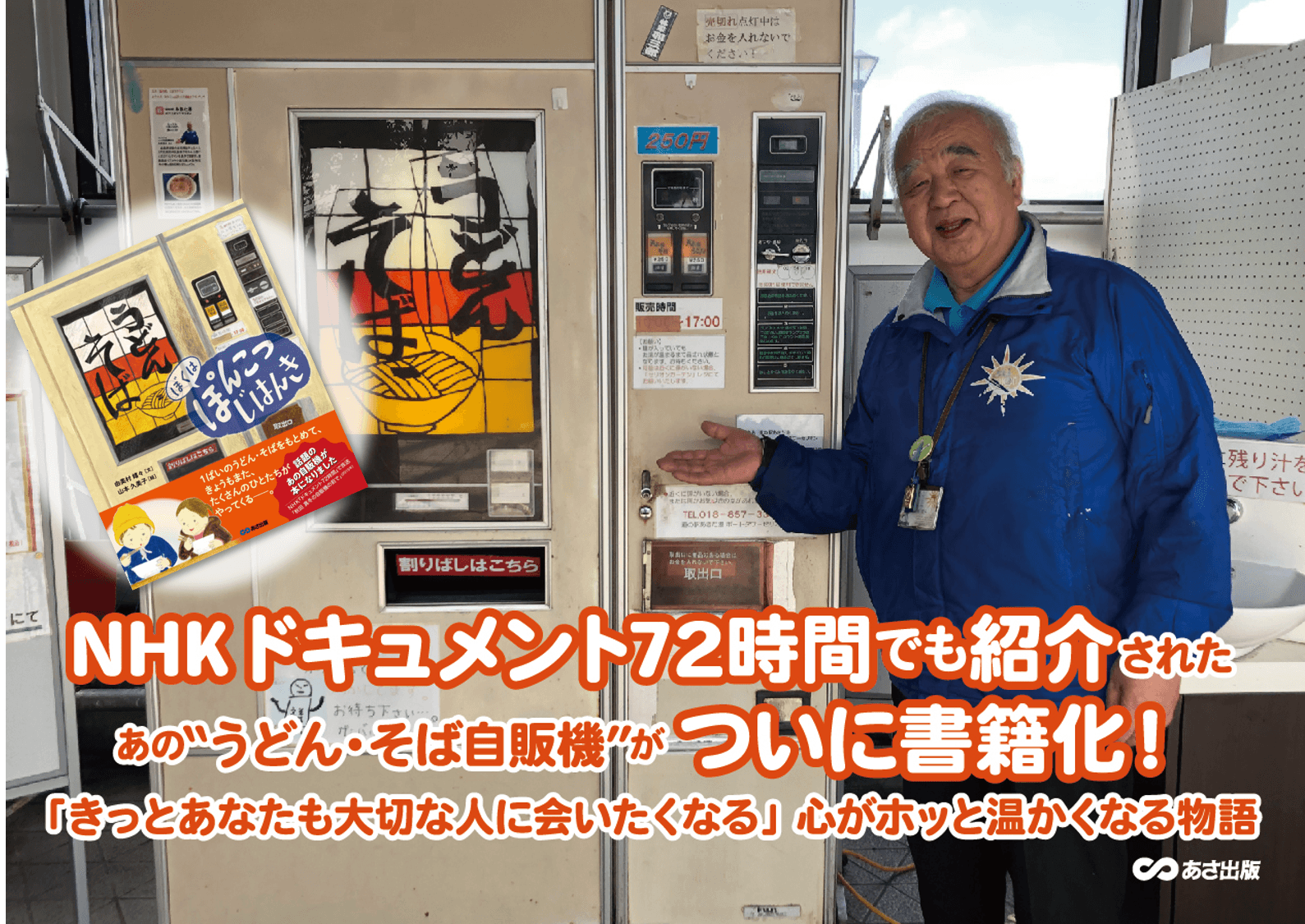 秋田県にある「佐原商店」 で50年以上、地元に愛され日々誰かがやってきている “うどん・そばの自販機”。「佐原商店」の閉店に伴い、なくなる危険もありましたが、地元民の強い要望などもあり、道の駅あきた港 SELION(セリオン)※ に移設され今なお、たくさんの人々に温かなうどん・そばを提供しています。そんな自販機と人々の心温まるエピソードが創作絵本になりました。