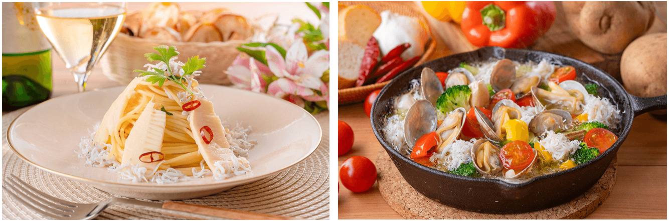 右:こちらも釜揚げしらすを使った一品。「釜揚げしらすとあさりのアヒージョ」。素材の旨味が溢れるオイルと塩味のシンプルな美味しさをお楽しみください。
