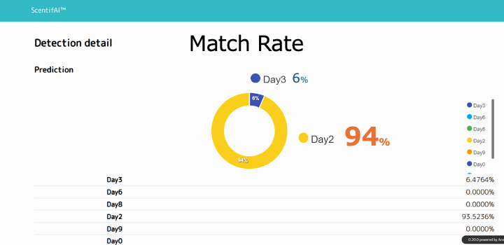 本事例では、経過日数2日目[Day2]の未知の豚肉サンプルをセンサー測定してニオイ判定した結果、94%と高い一致度で判定することができています。