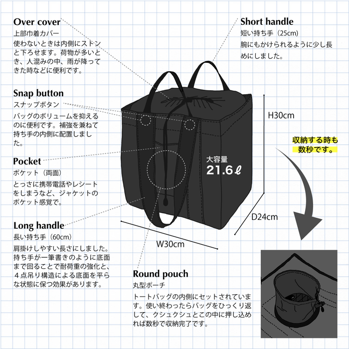 収納時はコンパクトで超軽量(130g)ですが、広げると21.6ℓの大容量トートバッグに変わります。