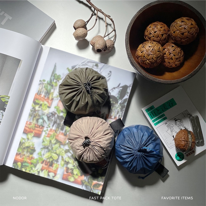 〈FAST PACK TOTE〉は、エコバッグとトートバッグの特徴を併せ持つ「進化系パッカブルトートバッグ」です。ハンモック構造をヒントに、そしてアウトドアの素材や機能性も盛り込み企画開発しました。