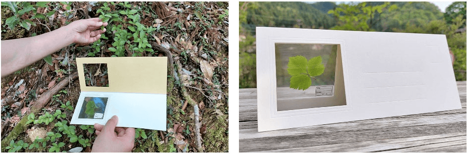 ② 散策路で見つけた自然のかけらをカードに閉じ込め、採取地や日付、その時の光景・気持ちなど、思い思いに書き添えれば、旅の標本カードの完成です。
