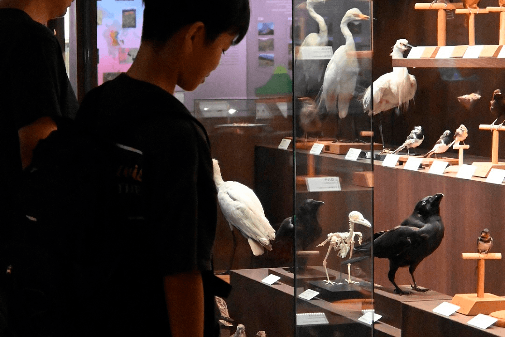 さらに、現在開催中の企画展「あなたのそばにエイリアン⁉―身近な外来生物―」の展示室では、熊本の身近にある外来種を中心に展示されており、「シロツメクサが外来種と知ってびっくりした」など、参加者が様々なリアクションを示していました。実際に企画展を手掛けた学芸員から直接話を聞くことができ、展示の構成に込められた意図や、パネルには載っていない裏話、展示準備の舞台裏など、普段は聞くことのできない貴重な情報に、参加者は熱心に耳を傾けていました。