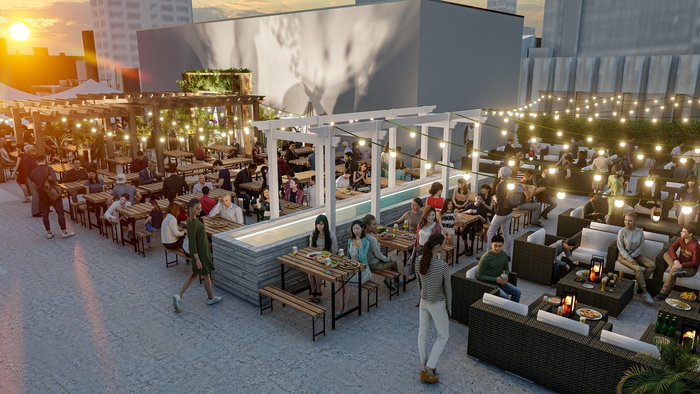 まるでカリフォルニアの西海岸に居るようなオープンエアーの雰囲気が楽しめる開放的なビアガーデンがコンセプト。心地よい風が吹き抜けるフロアに、緑に囲まれるグリーンウォールや涼しげなプールを設置し、映える空間を演出。リラックスできる個室的なパーゴラ席や涼やかなウォーターサイド席、プレミアムなソファー席など約300席をご用意。