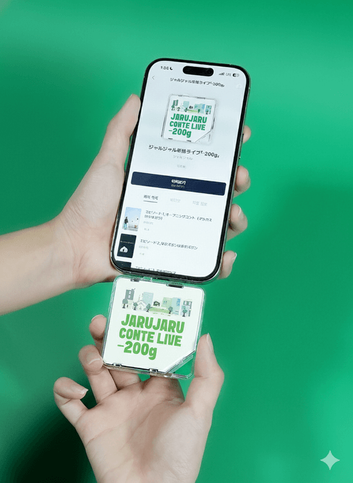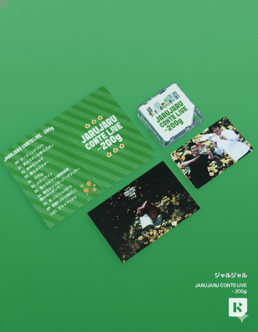 日本初となるジャルジャルのKiTpage「-200g」は、本体に収録されるライブフォトブックの他に、ステッカー、フォトカードなどが同封されており、100枚以上にも及ぶ高画質のライブ写真やメンバーが直接録音した音声コメントも独占収録され、ファンにとって特別なアイテムとなるだろう。