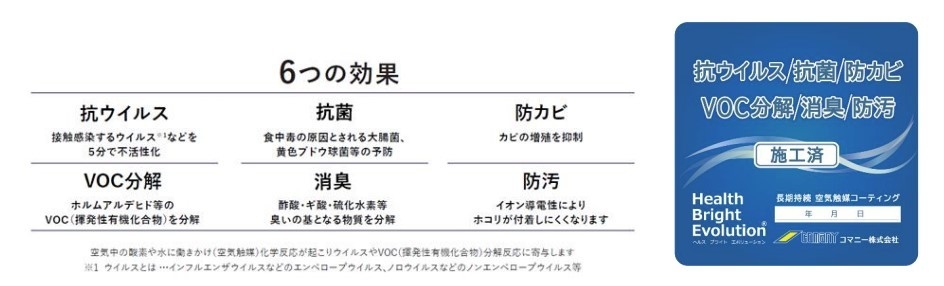 店内における飲食不安を軽減するため、施設共用部(エントランスやエレベーター)をはじめ、各店舗の壁や什器(椅子・テーブルなど)においても、抗菌・抗ウイルスコーティング「Health Bright Evolution(R)」を実施いたします。Health Bright Evolution(R)は、株式会社インフォファーム(本社:岐阜県岐阜市、代表取締役社長:辻 博文、以下「インフォファーム」)が提供する、天然ミネラル100%の無色透明・無臭・口に入れても安全な液体を噴霧することで施設内を抗ウイルス・抗菌加工することができる商品です。空気触媒で24時間365日作用し続け、接触感染するインフルエンザウイルス等を5分で不活性化する効果が確認されており、商業施設の接触感染予防対策に非常に効果的な手法となっております。