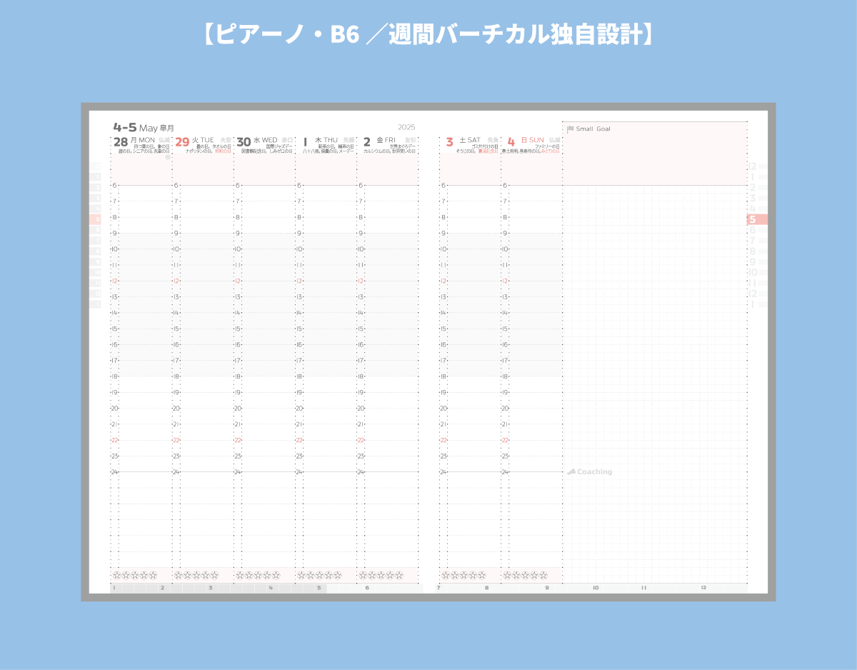 現在、手帳ユーザー様のなかで最も活用されているタイプの「週間バーチカル型」の手帳。ACTIO手帳は、週間バーチカル型の手帳として、「重さは気にせずしっかり書き込みたい派のA5サイズ」と「それなりに記入したいが手軽に持ち運びたい派のB6サイズ」の2サイズで展開しており、ご自身のライフスタイルに合わせてご選択いただけます。