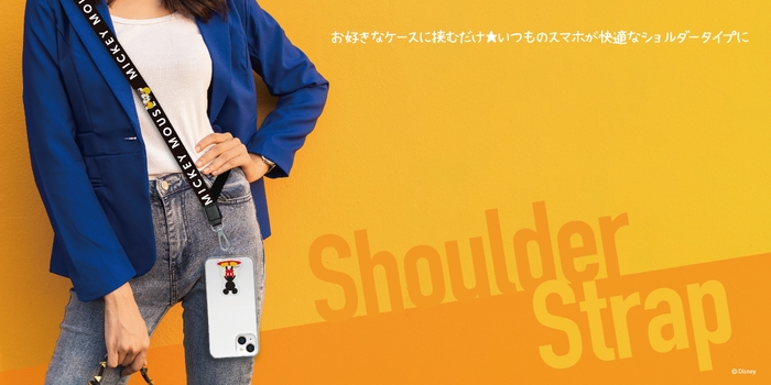 お気に入りのケースに挟むだけで快適なショルダータイプに切り替え可能な、ディズニーキャラクターデザインのストラップホルダー付 ショルダーストラップです。ストラップホールが無くても付属されている「ストラップホルダー」をケースに挟むだけでストラップを取り付けする事が可能です。(※お手持ちのケースや充電口の形状によってはホルダーが収まらない場合があります。)ショルダーストラップは、首掛けでの長さ調整も可能です。