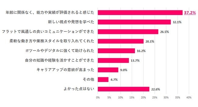 年下の上司と働いてよかった点としては、1位「年齢に関係なく、能力や実績が評価されると感じた」37.2%、2位「新しい視点や発想を学べた」32.1%、3位「フラットで風通しの良いコミュニケーションができた」26.5%でした。学びと挑戦が促進され、風通しのよい職場になるというメリットを感じた人が多いようです。