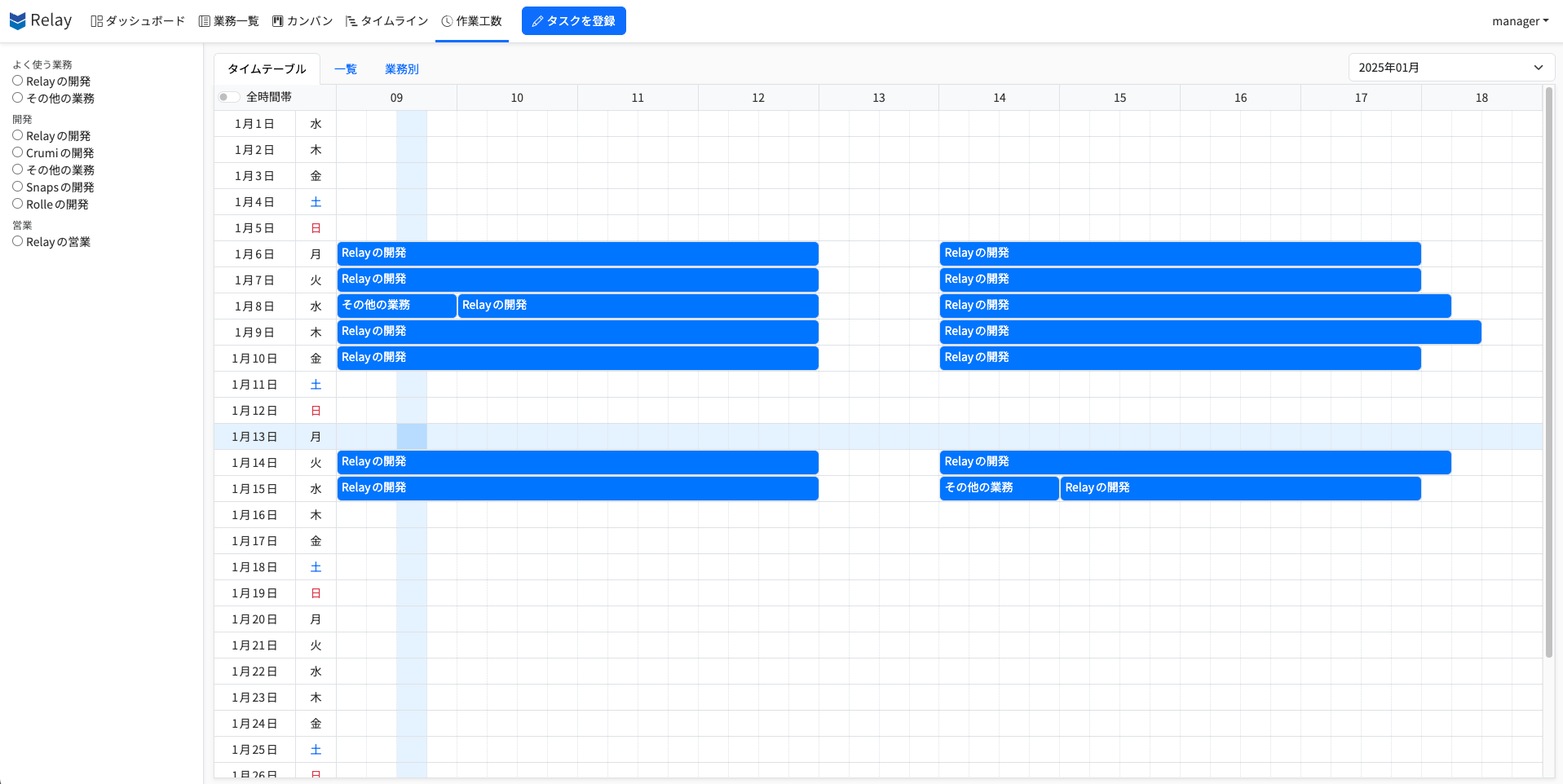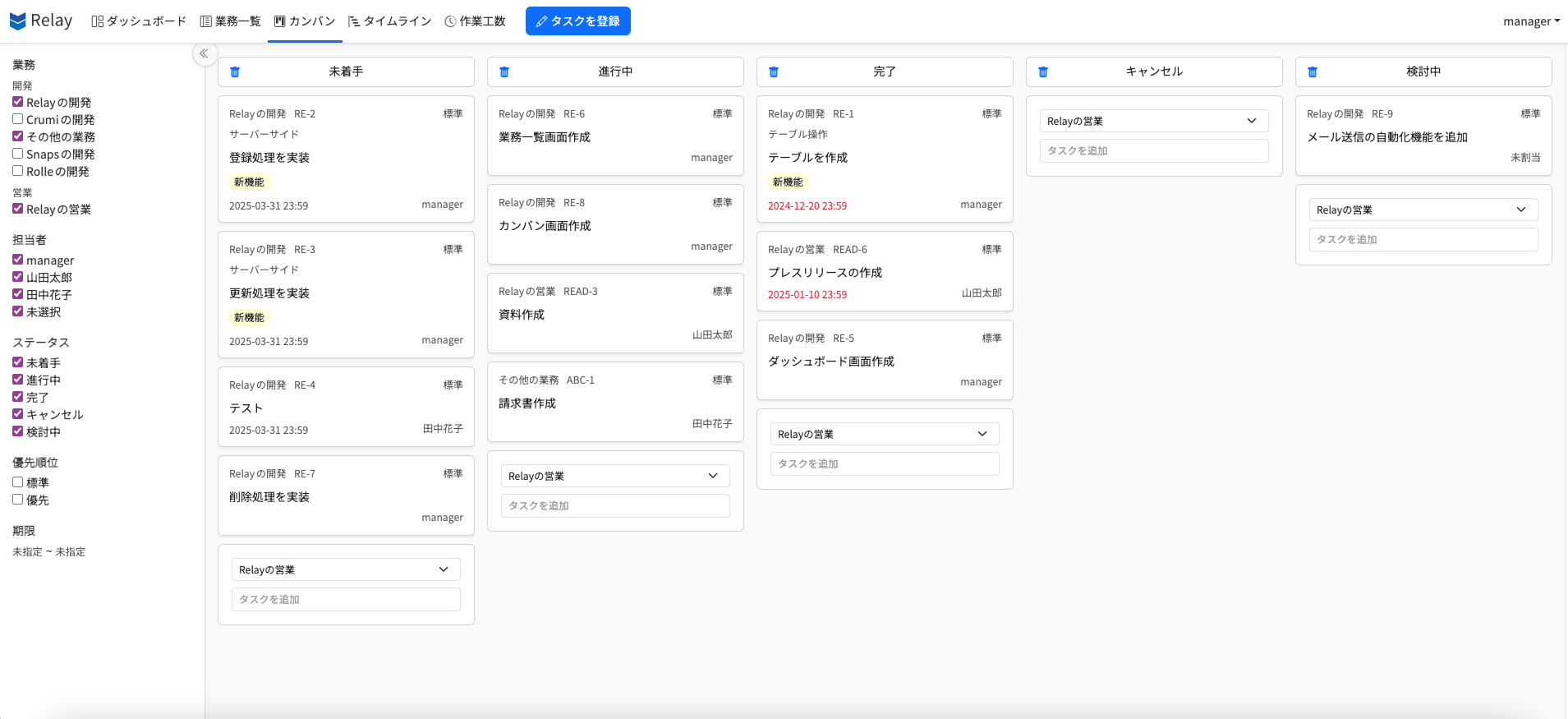 「Relay」は、日次業務からプロジェクトまであらゆるタスクをリレーのように「つなげる」ことで、様々な業務を見える化し、生産性向上を支援するクラウド型のタスク管理ツールです。インターネットに接続されたブラウザさえあれば、いつでもどこでもアクセスできます。