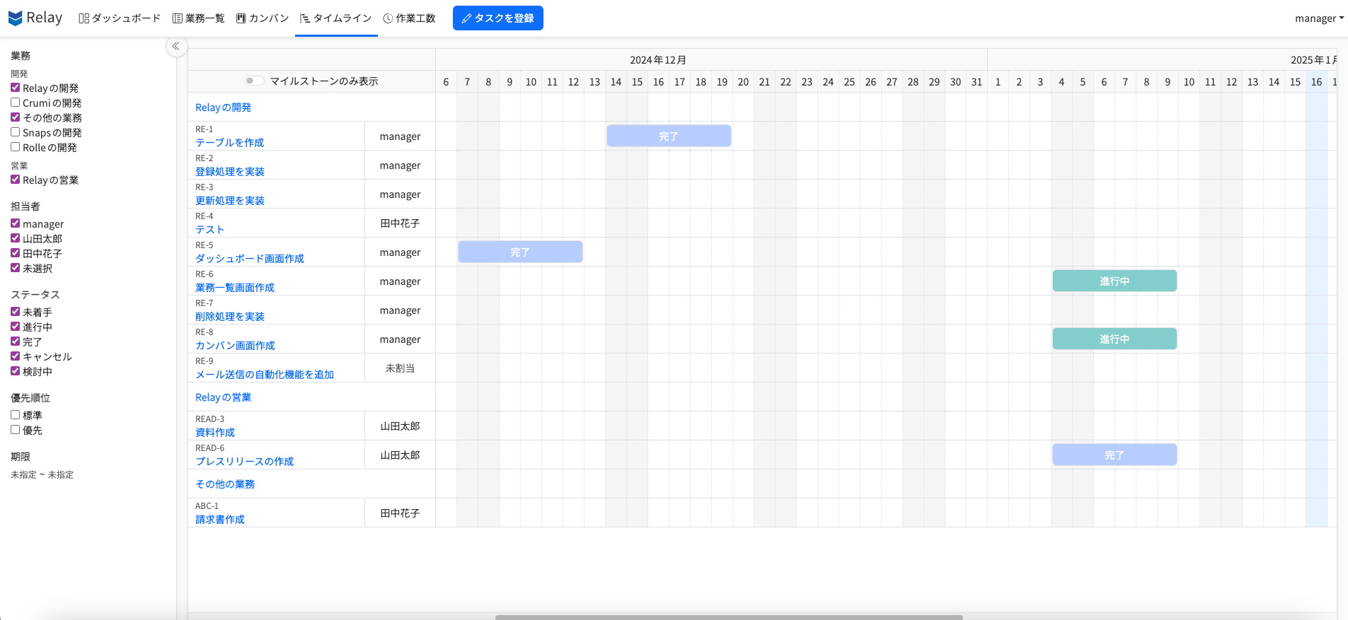 時間軸上にマイルストーンやタスクの期限を表示します。各タスクの位置を視覚的に確認することができ、プロジェクトの全体像と役割分担が明確になります。