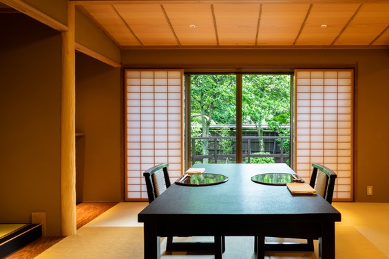 明治28年(1895)明治天皇の内親王、富美宮親王の避暑のために建てられ、昭和9年(1934)高松宮家別邸となったのち、昭和21年(1946)に払い下げを受けた歴史ある建物。随所に菊の紋が残されていることから「菊華荘」と名付けられました。純日本建築の落ち着いた佇まいと、窓の外に広がる四季折々の表情を見せる日本庭園がございます。