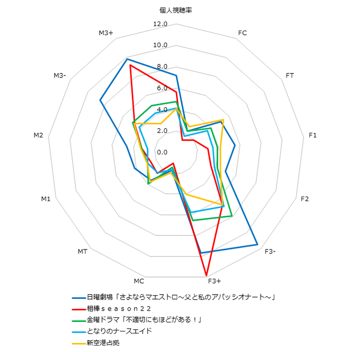 一方で、「新空港占拠」は若年層の視聴割合が高くなっており、特にFT層の視聴率が5作品中最も高くなっています。