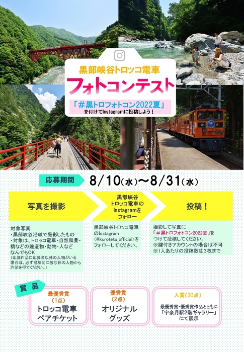 黒部峡谷トロッコ電車(運営:黒部峡谷鉄道株式会社、所在地:富山県黒部市、代表取締役社長:鈴木 俊茂)では、初開催イベント「黒部峡谷トロッコ電車フォトコンテスト」を2022年8月10(水)~8月31日(水)まで開催いたします。