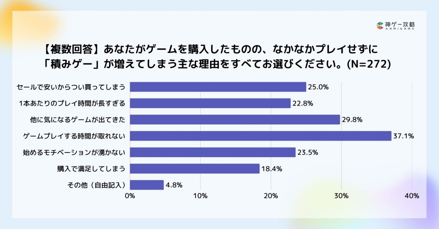 ・積みゲーの理由で最多は「プレイ時間が取れない」(37.1%)、次いで「他のゲームに目移り」(29.8%)