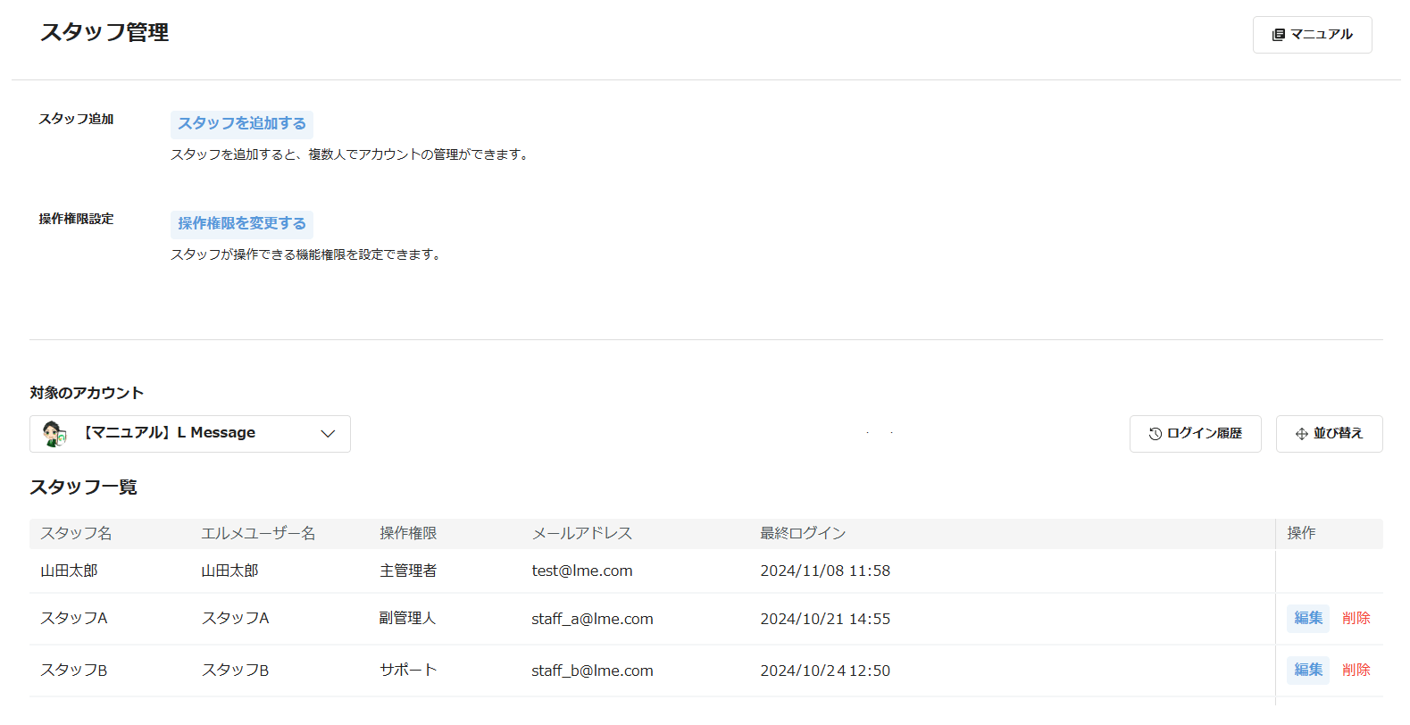 「スタッフ管理機能」は、エルメを複数のスタッフで効率的に運営するための機能です。