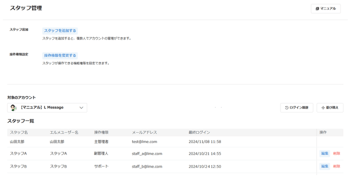 LINE公式アカウント拡張ツール「L Message(エルメッセージ)」は、複数スタッフでのアカウント運用が可能。 スタッフ管理の権限設定機能はそのままに、ログイン・ログアウトの切り替えがより効率的に。