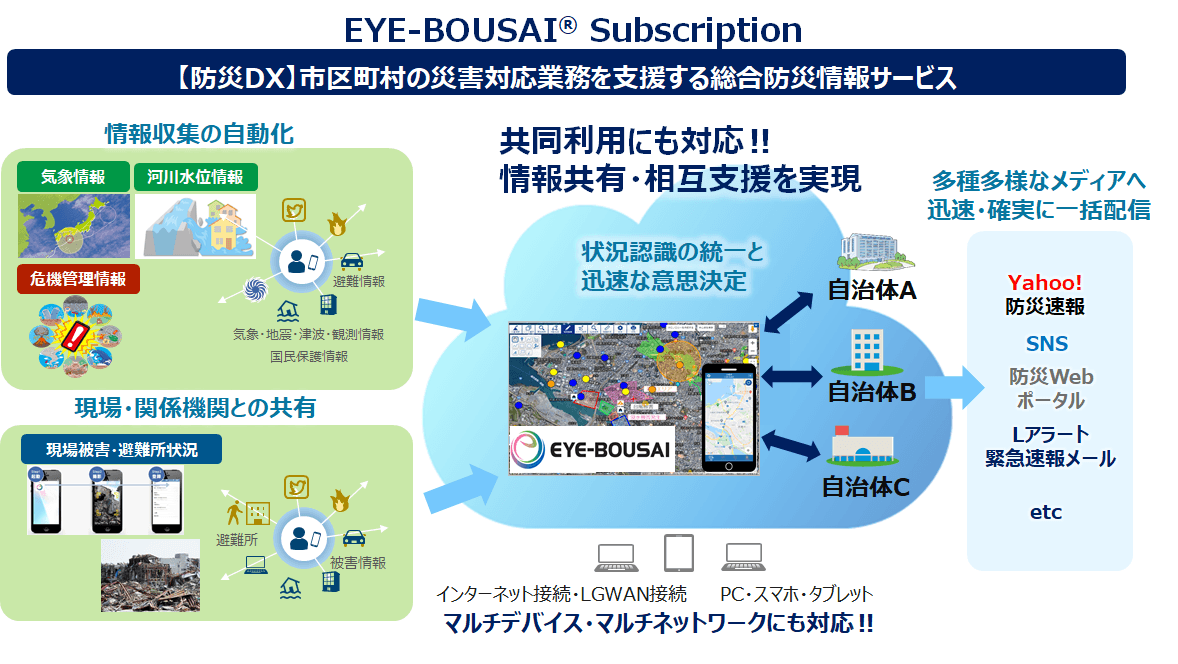 今回、新たに提供する「EYE-BOUSAI(R) Subscription」は、低価格かつ最短1カ月で導入できるクラウド型パッケージのサブスクリプションサービスで、業界では初めてとなる共同利用ができる総合防災情報システムです。本サービスは、中小規模の自治体の防災システムの導入・運用に関する課題を解消し、少ない人員の場合であっても、迅速な情報共有や意思決定の実現に寄与します。また、隣接の自治体同士のスムーズな情報共有や相互支援、災害対応に関するノウハウの共有といった横の連携を図ることができます。