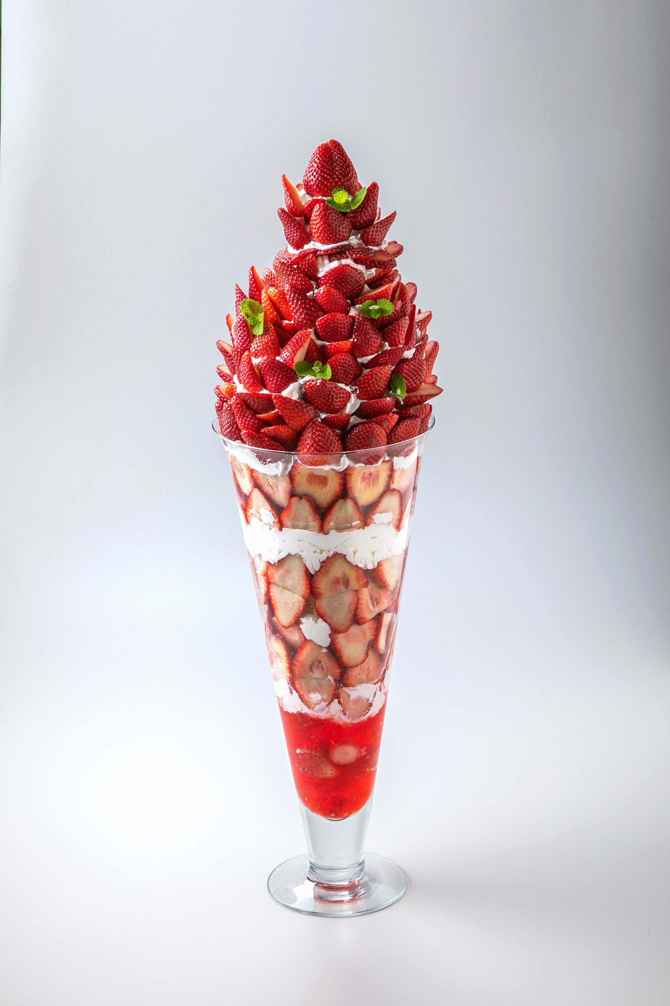 平日1日1個限定、完全予約制のこのパフェは、自社農園で採れた新鮮ないちごをこれでもか!と使用。約70粒のいちごを使用し、高さ約70cm、重さ7kgもある、他ではなかなかみることができないパフェとなっております。いちごは主に栃木が誇る品種の「スカイベリー」や「とちあいか」を使用します。1つ 8,800円(税込)。