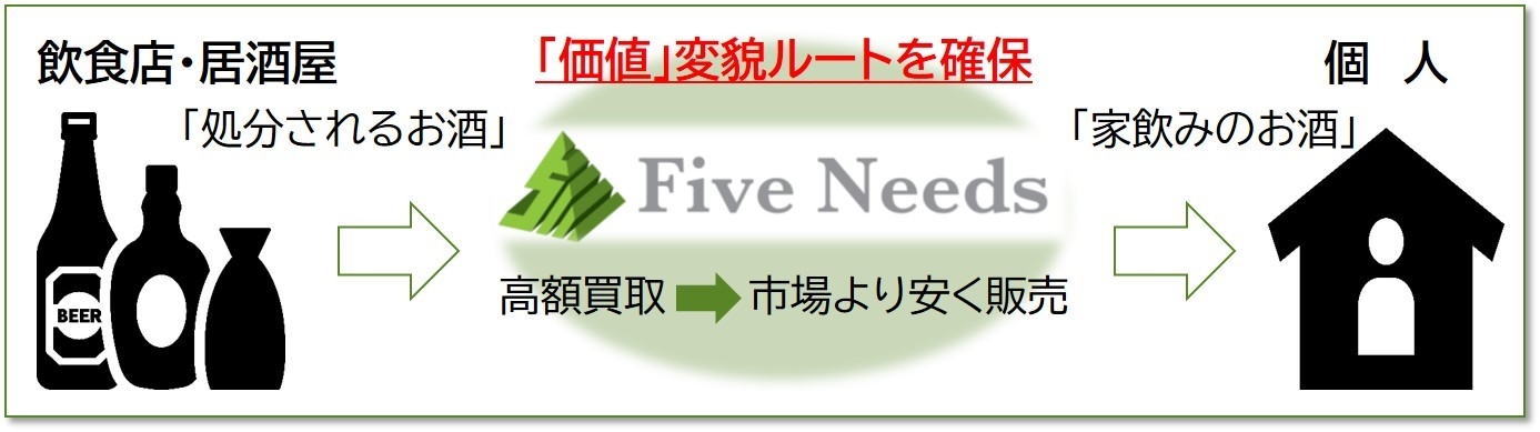 お酒の買取販売事業を展開する株式会社ファイブニーズは、3度目の緊急事態宣言が延長される中「お酒の流れ」を変えて「社会の流れ」を変える挑戦をスタートします。閉店せざるを得ない飲食店が抱える処分予定のお酒を買取り、個人の「家飲み」用のお酒として販売するルートを確保することで、捨てられるはずだったお酒を「新たな価値」へ変えていきます。
