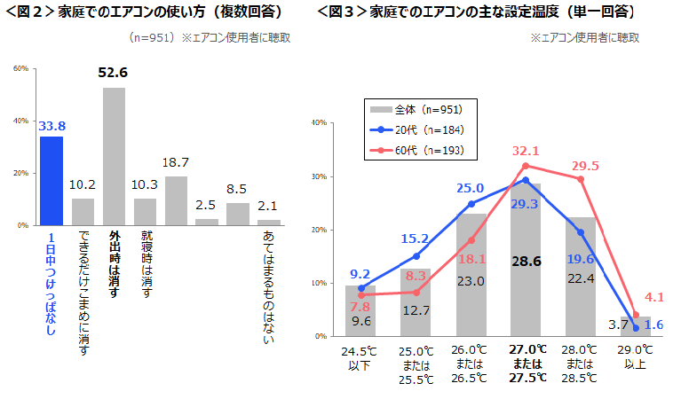 エアコンの使い方をみると、「外出時は消す」人が約半数。「1日中つけっぱなし」は3割ほど。