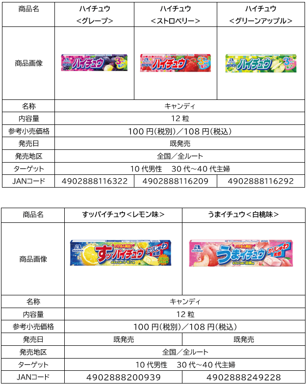 しゅわうまイチュウ各種、ハイチュウプレミアム各種、ハイチュウアソート各種、