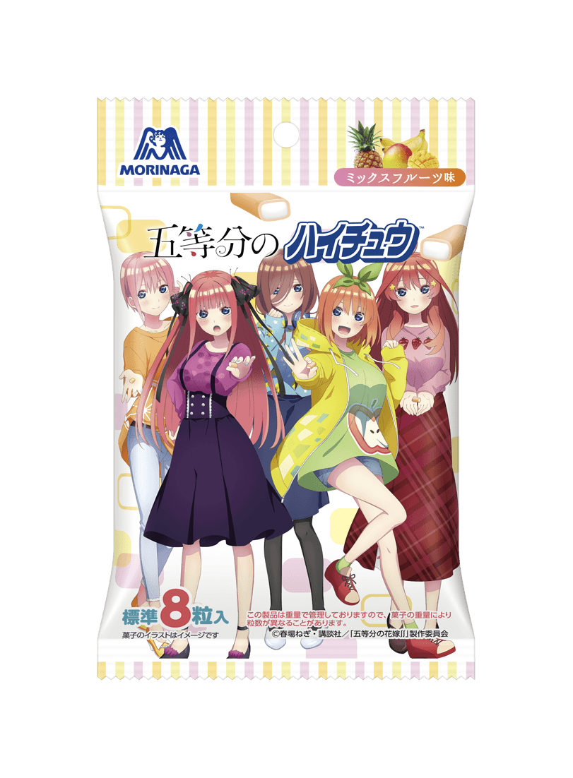10月19日(火)より期間限定でコラボ商品「五等分のハイチュウ」を発売いたします。五つ子の可愛いイラスト入り個包装に入ったミックスフルーツ味のハイチュウで、描き下ろしオリジナルシール1枚付です(全6種類)。どのシールが入っているかは購入後のお楽しみに。