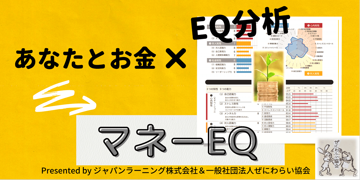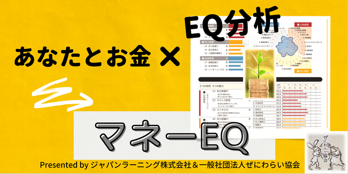 「お金の不安を笑顔に変える」をモットーに活動する団体、一般社団法人ぜにわらい協会(東京都渋谷区、理事長吹田朝子)は、日本で初めて「EQ理論」を企業教育のコンテンツとして開発し、26年間45万人以上のデータ分析実績を持つジャパンラーニング株式会社(東京都中央区、代表取締役加来勝正)と共同で、インターネットによるお金のEQ診断サービス「マネーEQ」を2021年9月1日(水)より開始しましたのでご報告いたします。