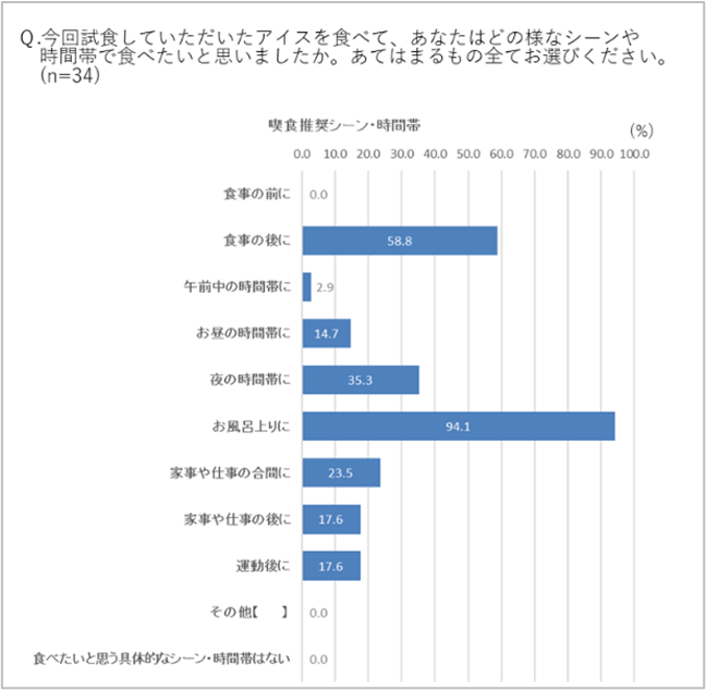 本商品を食べたいシーンや時間帯を聞いたところ、「お風呂上がりに(94.1%)」、「食事の後に(58.8%)」に特に多くの回答が集まりました。一日を通してさまざまなシーンにマッチするデザートですが、爽やかさが特長であることから、お風呂上がりや食後といった、気持ちを落ち着かせたいリラックスタイムにぴったりです。次いで「夜の時間帯に(35.3%)」と回答した人も多く、一日を締めくくるご褒美デザートとしてもおすすめです。