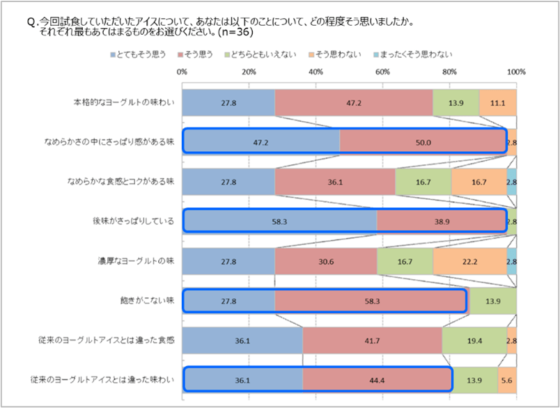 本商品の発売に向けて、全国の20代~50代の男女を対象に、商品への感想を調査しました。その結果、91.6%の人が「おいしい」と回答しました。味の印象については「なめらかさの中にさっぱり感がある味(97.2%)」、「後味がさっぱりしている(97.2%)」、「飽きがこない味(86.1%)」、「従来のヨーグルトアイスとは違った味わい(80.5%)」と回答した人が多い結果となりました。開発時にこだわった、濃厚感とすっきり感の両立を実感していただける商品になっています。