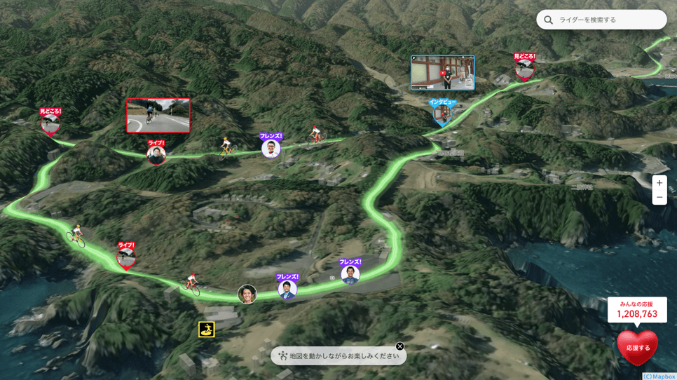 ・応援したいライダーを検索することで、そのライダーが 「今どこにいるか、どこをどのように走ってきたのか」を見ながら、遠隔で応援することが可能です。また、Mapbox社のライダー車載カメラで撮影されたライブ映像により、スタートやゴールのダイナミックな瞬間や見晴らしのいいコースを見ることができるため、スピード感や風景の素晴らしさを応援しながら追体験できます。