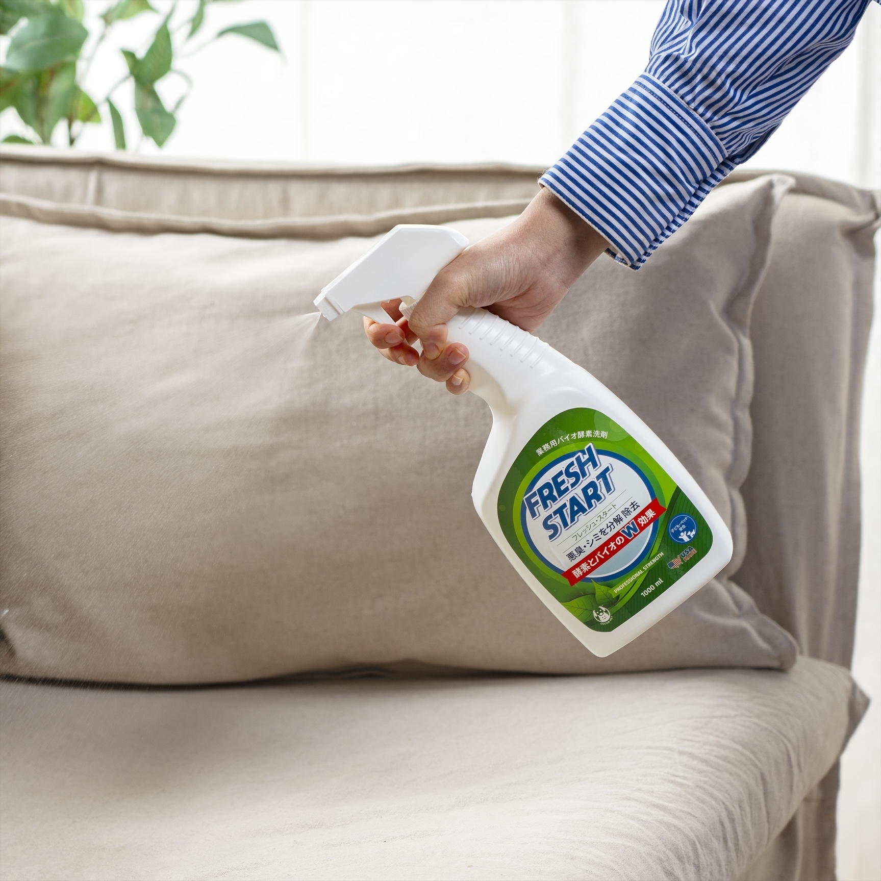 フレッシュスタートを臭いの元やシミ汚れに浸透するよう十分にスプレーし、やわらかいブラシ・スポンジ等で軽くこすり、その後、自然乾燥させればOK!頑固な臭い、汚れにはこの作業を何回か繰り返します。