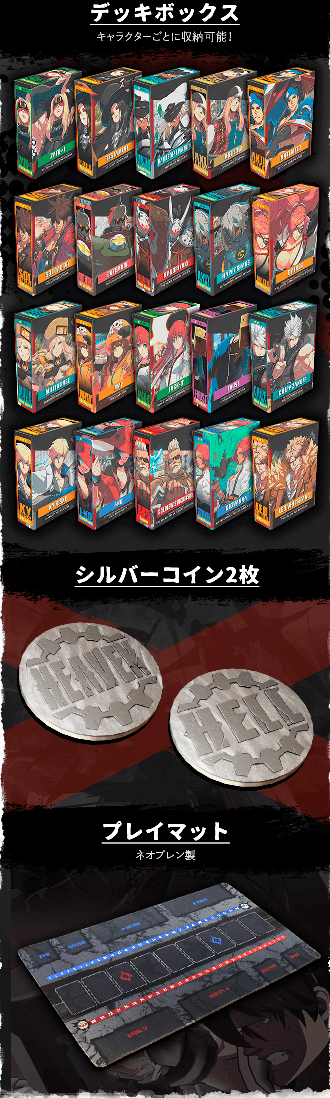 695枚のカードと、それぞれのキャラクター用のデッキボックス、プレイマットが付属します。