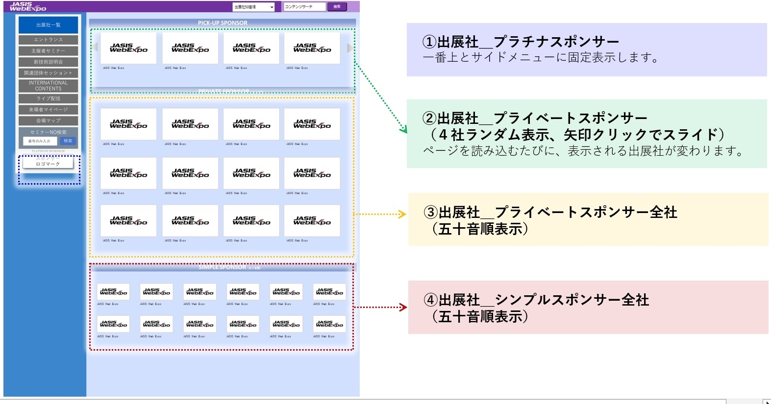 バーチャル展示会場においても、出展社一覧のランダム表示と50音順表示を織り交ぜることで、目的の企業へアプローチしやすくしています。