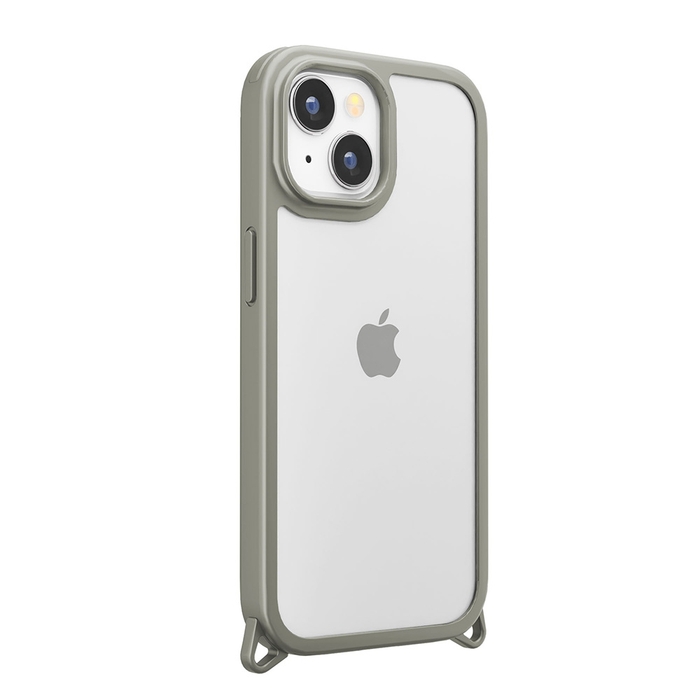 ケース四つ角には、ストラップホールをお好みの位置に変更出来るリングパーツ式を採用し、お手持ちのショルダーストラップ・ハンドストラップ等を自由に取り付けが可能です。ケース内側はエアークッションを採用し、軍用規格(MIL-STD-810G)の落下と振動試験をクリアした耐衝撃設計。ケース背面は薄さ0.3mmのポリカーボネイト素材でケースをつけたままMagSafe充電器を使用する事が可能です。サイド部分はやわらかく丈夫なTPU素材でボタン周りもしっかり保護します。サイド部分がやわらかい素材なのでケースの着脱も簡単です。