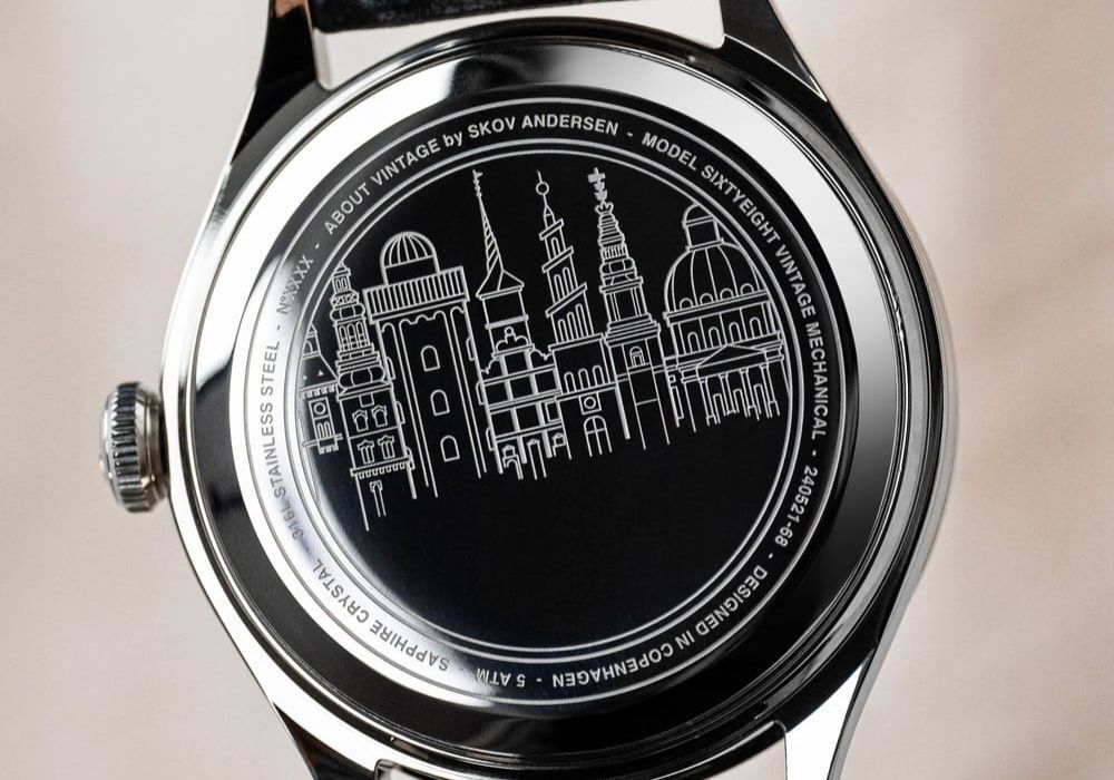 今回の時計の裏蓋は、会社の所在地であるコペンハーゲンの美しい街並みのアイコニックな建物が詳細に描かれています。