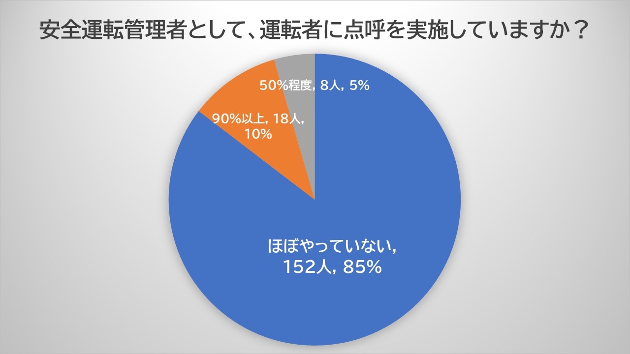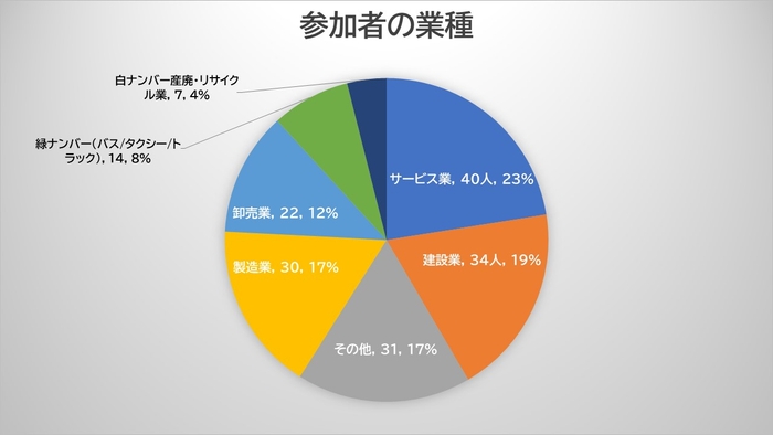 今回、多岐にわたる業種、多くの安全運転管理者の方にご参加頂くことができました。自社の過去の飲酒事案、現在使用している検知器や点呼等の運用状況等について率直なご回答をいただきました。
