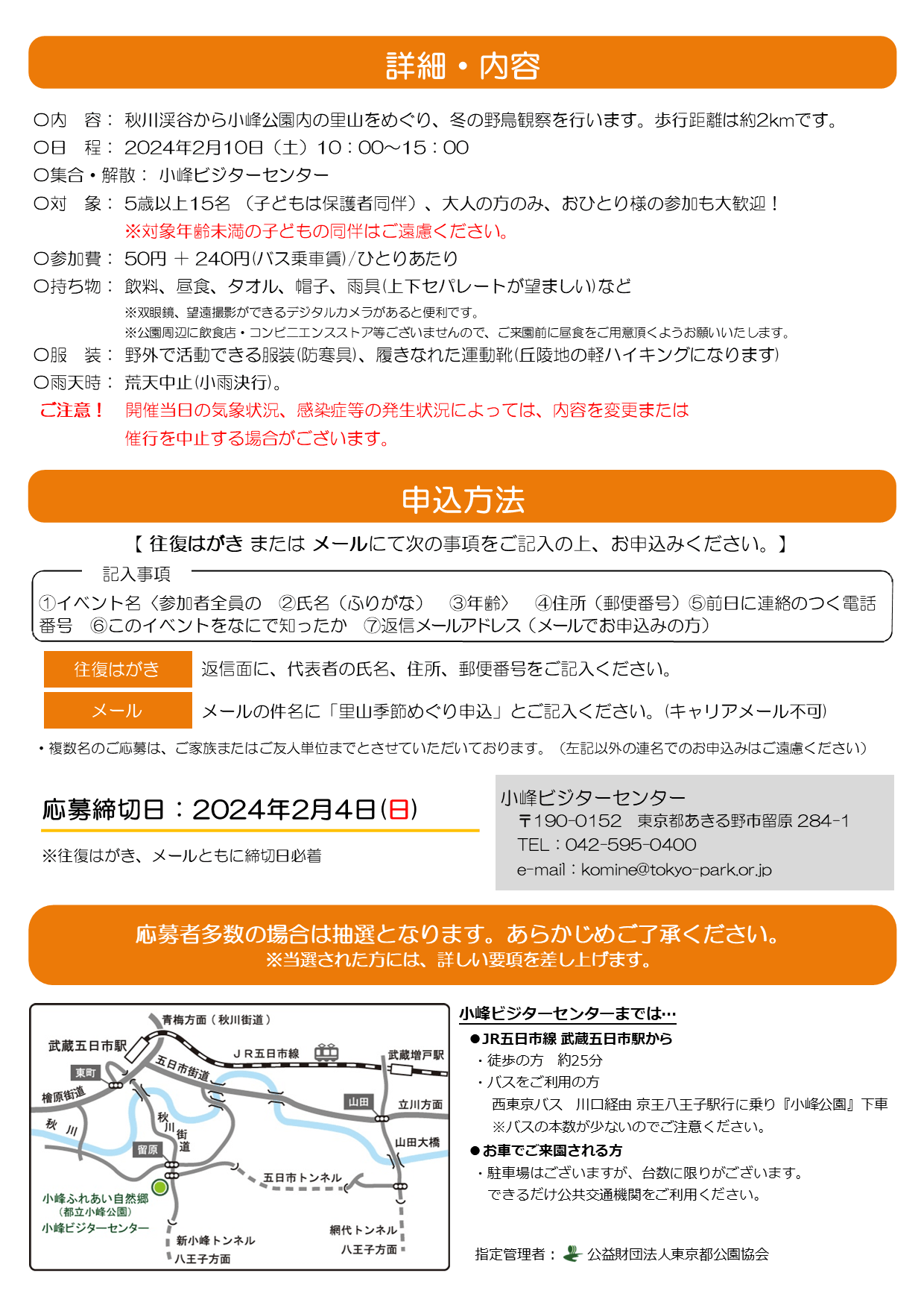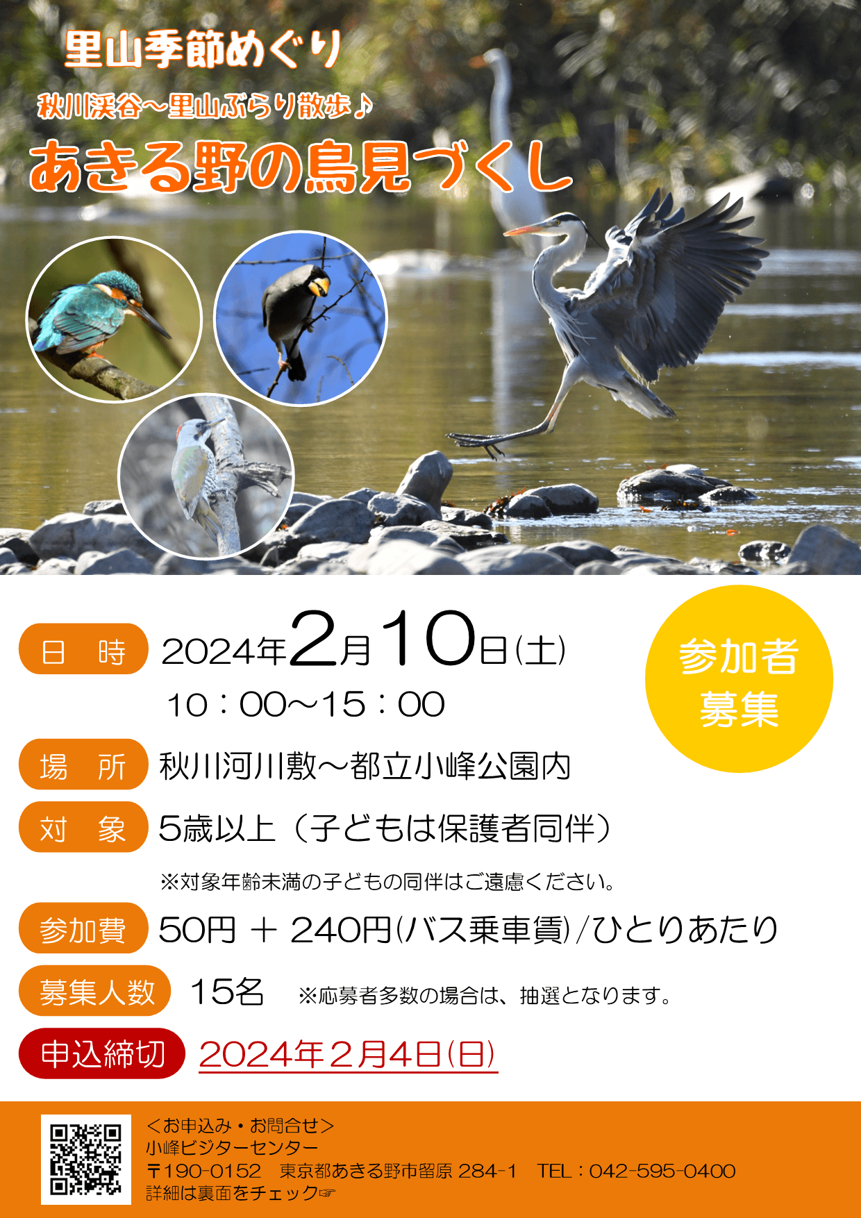 秋川渓谷から小峰公園内の里山をめぐり、約2㎞の行程を散策しながら冬の野鳥観察を実施します。