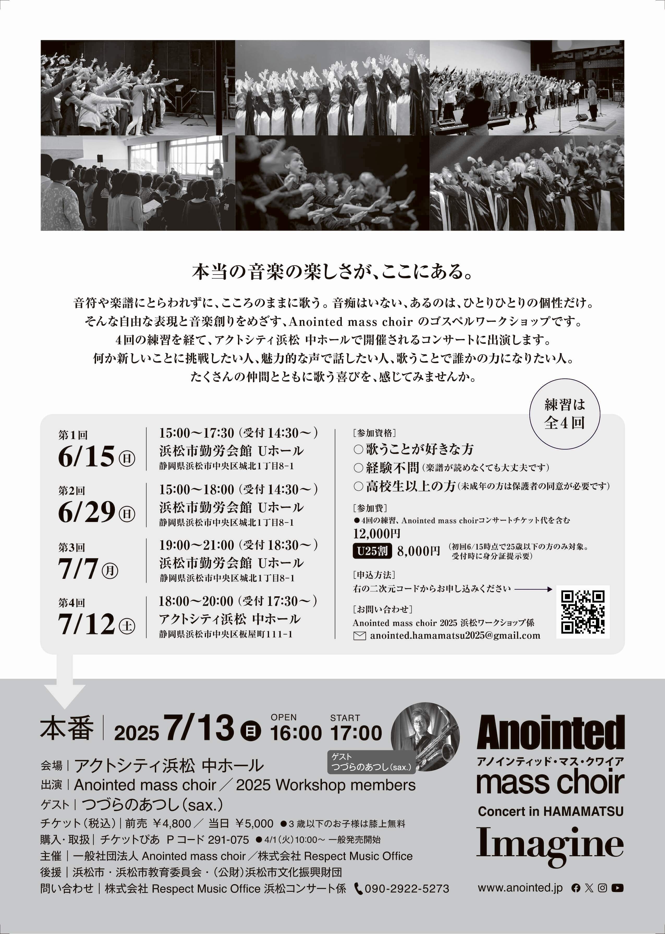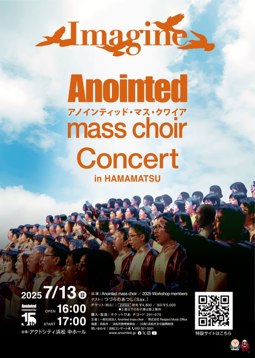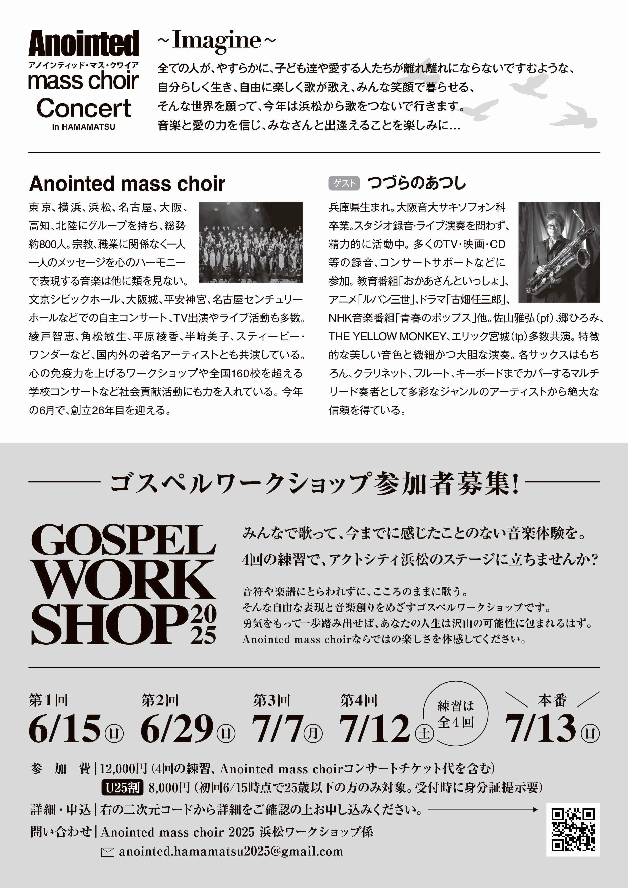 全国で活動をするゴスペルグループ「Anointed mass choir(アノインティッド・マス・クワイア)」は、2025年7月13日(日)、アクトシティ浜松 中ホールにて、音楽を通して“平和”を願うことをテーマに、サックス奏者 つづらのあつしをゲストに迎えて、コンサート「Anointed mass choir Concert in HAMAMATSU“Imagine”」を開催します。