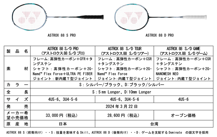 ヨネックス株式会社(代表取締役社長:アリサ ヨネヤマ)は、ダブルスをコンセプトに開発された上級者向けバドミントンラケット「ASTROX 88 S/D PRO」、「ASTROX 88 S/D TOUR」、同コンセプトデザインの中級者向け「ASTROX 88 S/D GAME」を2024年3月22日より世界同時発売いたします。