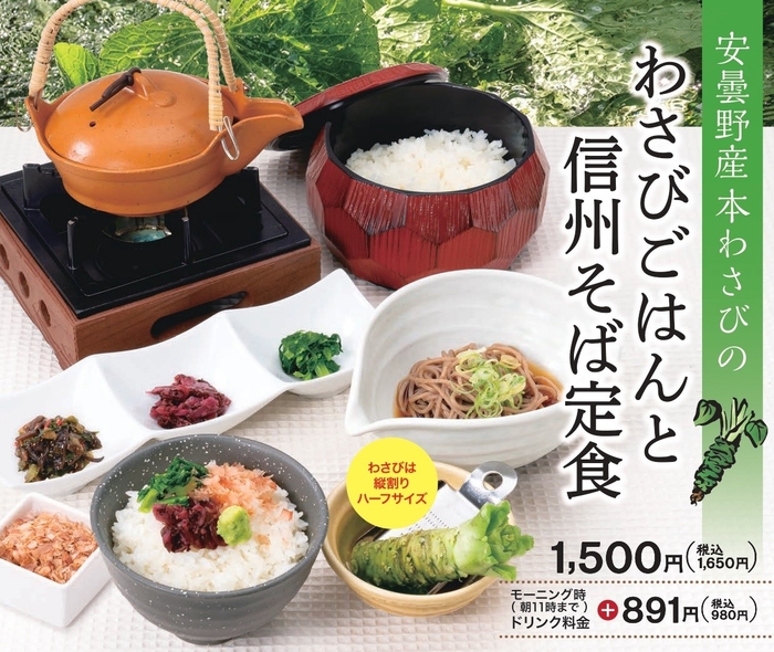 兵庫・大阪・奈良で13店舗を展開する「上高地あずさ珈琲」の姫路伊川谷店・奈良橿原店店限定・阪急三番街店で!2月17日(月)より「わさびごはんと信州そば定食」を期間限定で販売します。