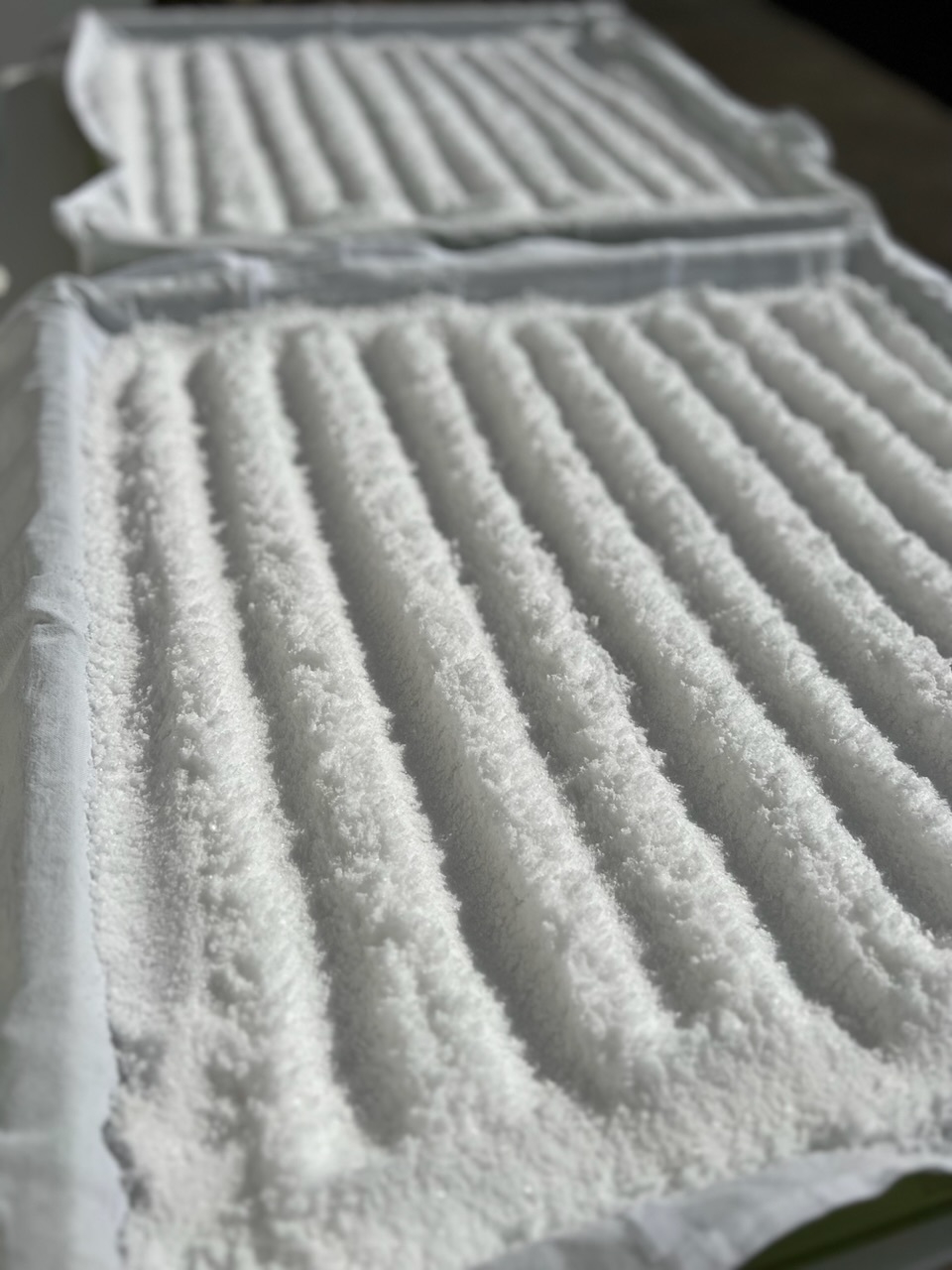 大きく美しい結晶ができるのは世界でもバリ島テジャクラ塩田のみと言われていましたが、自社実験したところ、テスト的にですが、自社でも開発ができる目処が立ちました。本格的に平釜を導入し、日当たりの良い製塩所屋上を活用し、大きな結晶を作成しピラミッドソルトを正式に製品化します。
