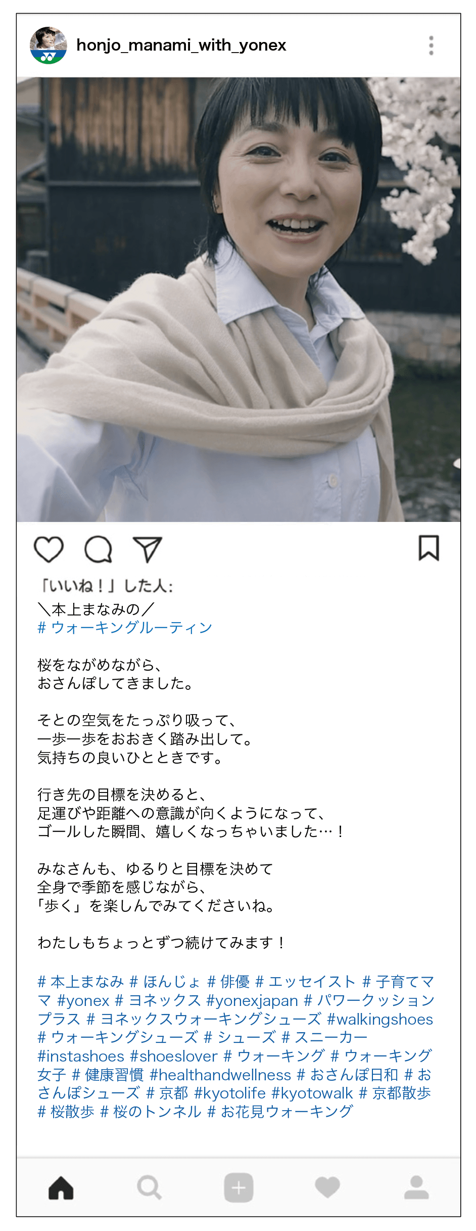 また、4月9日(金)よりインスタグラム上で、本上まなみ×ヨネックス『本上まなみの#ウォーキングルーティン』を発信してまいります。
