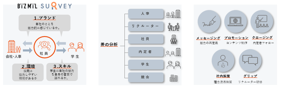 ターゲット学生から見た自社と競合のブランドイメージや、 ターゲット学生と人事・社員から見た自社のブランドイメージ…など、 あらゆる視点のギャップを可視化し、採用広報を最適化します。 さらに、採用プロセスごとの測定・分析により、 年1回ではないリアルタイムな採用広報の修正も可能にした、全く新しいサーベイです。