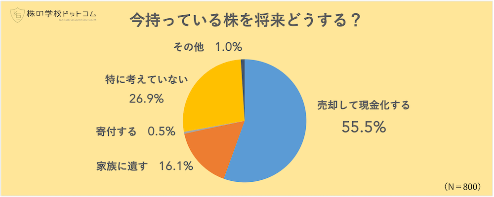 関連して、現在保有している株式について今後どうするつもりでいるかについても質問しました。「売却して現金化する」「家族に遺す」「寄付する」「特に考えていない」「その他」の中から選んでもらったところ、最も多かった回答は「売却して現金化する」で半数を超える55.5%でした。