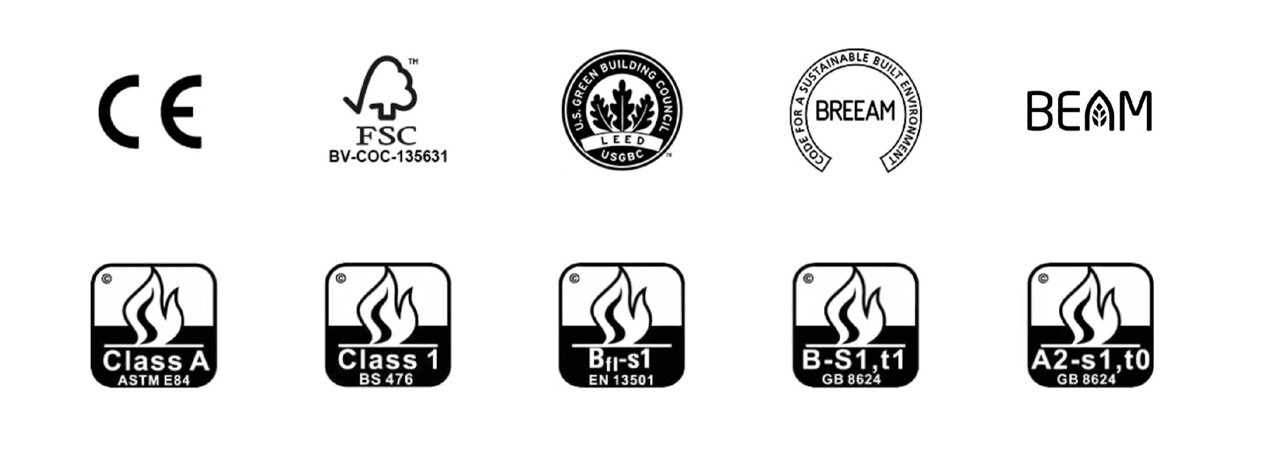 当社の集成竹材は、建材の安全・健康・環境保護に関する基準を満たす欧州のCE認証、適切に管理された森林からの木材調達を保証する国際的なFSC認証、対燃性・耐火炎拡散性試験における最高クラスの認証を取得しています。